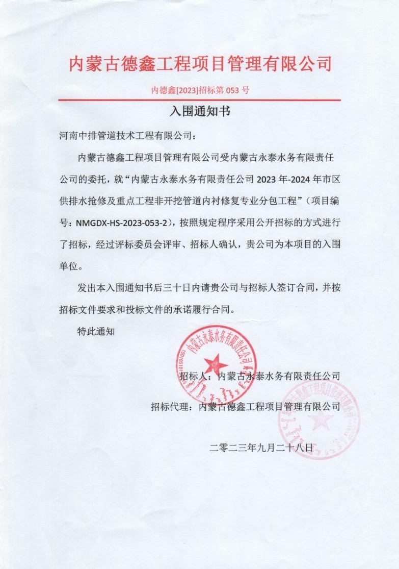 内蒙古德鑫工程项目管理有限公司入围通知书
